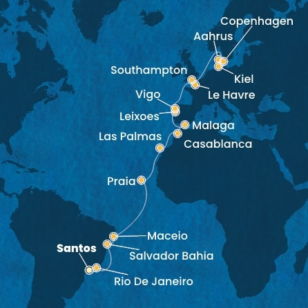 СантосГрад Сантос се намира в щата Сао Пауло в южна Бразилия. Основан през 1546 г., днес градът е популярна туристическа дестинация и притежава рекорд на Гинес за най-дългата крайбрежна градина в света с дължина от над 5 км. Ако Вашият круиз има спирка в Сантос и не искате да прекарате времето си на някой от неповторимите бели плажове, бихте могли да разгледате неговия старинен квартал и аквариума. |