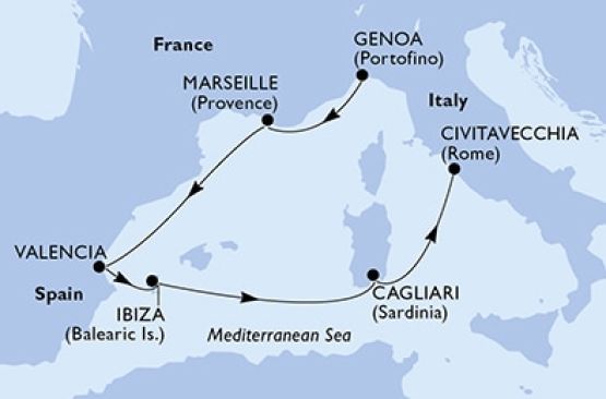 Рим (порт Чивитавекия)Град Чивитавекия се намира в област Лацио на провинция Рим, на брега на Тиренско море. Пристанището на Чивитавекия осъществява връзка с островите Сардиния, Сицилия, Корсика, Малта, с градовете Барселона, Тулон и с Тунис. Населението наброява едва 50 000 души, но въпреки това Чивитавекия се смята за второто по значение европейско пристанище, като се има предвид броя на преминаващите пътници.