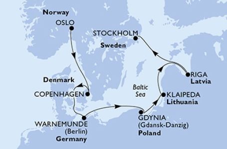 *Към цената е дължима и допълнителна такса обслужване на кораба в размер на 0 € / 0 лв.- Маршрут на круиза: Осло - Копенхаген - Варнемюнде - Гдиня/Гданск - Клайпеда - Рига - Стокхолм