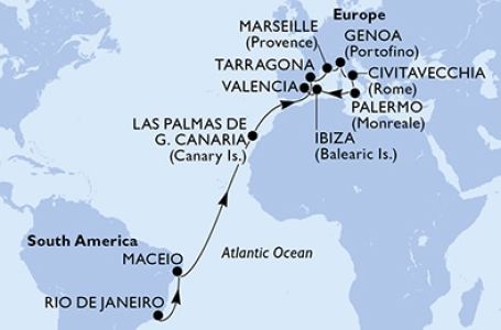 *Към цената е дължима и допълнителна такса обслужване на кораба в размер на 0 € / 0 лв.- Маршрут на круиза: Рио де Жанейро - В открито море - В открито море - Масейо̀ - В открито море - В открито море - В открито море - В открито море - В открито море - В открито море - Лас Палмас (Гран Канария) - В открито море - В открито море - Тарагона - Марсилия - Генуа - Рим (порт Чивитавекия) - Палермо (Сицилия) - В открито море - Ибиса - Валенсия