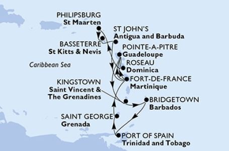 - Маршрут на круиза: Фор дьо Франс - Поант-а-Питр - Кингстаун - Бриджтаун - В открито море - Порт ъф Спейн - Сейнт Джордж - Фор дьо Франс - Поант-а-Питр - Розо - Филипсбург, Синт Мартен - В открито море - Бастер - Сейнт Джоунс - Фор дьо Франс