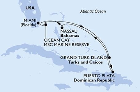 *Към цената е дължима и допълнителна такса обслужване на кораба в размер на 0 € / 0 лв.- Маршрут на круиза: Маями (Флорида) - Насау - Оушън Кий - MSC частен резерват - В открито море - Гранд Търк - В открито море - Маями (Флорида)
