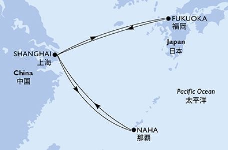 *Към цената е дължима и допълнителна такса обслужване на кораба в размер на 0 € / 0 лв.- Маршрут на круиза: Шанхай - В открито море - Наха (Япония) - В открито море - Шанхай - В открито море - Фукуока - В открито море - Шанхай