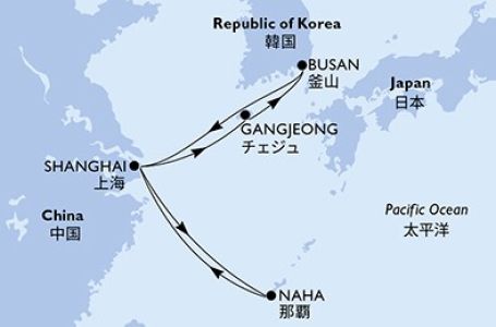*Към цената е дължима и допълнителна такса обслужване на кораба в размер на 0 € / 0 лв.- Маршрут на круиза: Шанхай - В открито море - Наха (Япония) - В открито море - Шанхай - о-в Джеджу - Бусан - В открито море - Шанхай
