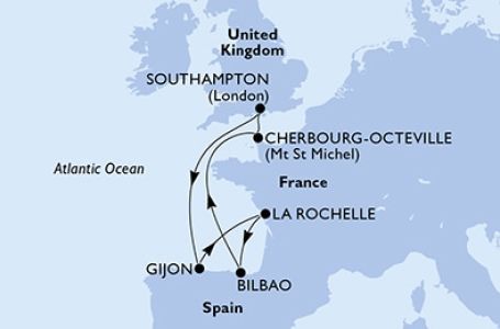 *Към цената е дължима и допълнителна такса обслужване на кораба в размер на 0 € / 0 лв.- Маршрут на круиза: Саутхемптън - В открито море - Хихон - Ла Рошел - Билбао - В открито море - Шербур - Саутхемптън