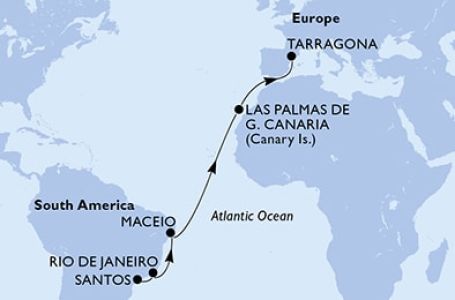*Към цената е дължима и допълнителна такса обслужване на кораба в размер на 0 € / 0 лв.- Маршрут на круиза: Сантос - Рио де Жанейро - В открито море - В открито море - Масейо̀ - В открито море - В открито море - В открито море - В открито море - В открито море - В открито море - Лас Палмас (Гран Канария) - В открито море - В открито море - Тарагона