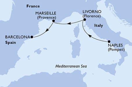 *Към цената е дължима и допълнителна такса обслужване на кораба в размер на 0 € / 0 лв.- Маршрут на круиза: Неапол - Ливорно (Флоренция и Пиза) - Марсилия - Барселона