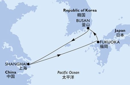 *Към цената е дължима и допълнителна такса обслужване на кораба в размер на 0 € / 0 лв.- Маршрут на круиза: Шанхай - В открито море - Фукуока - Бусан - В открито море - Шанхай