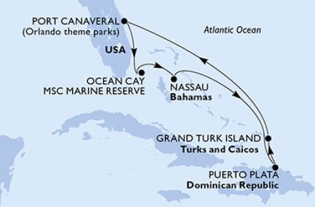 *Към цената е дължима и допълнителна такса обслужване на кораба в размер на 0 € / 0 лв.- Маршрут на круиза: Орландо (Порт Канаверал) - Оушън Кий - MSC частен резерват - Насау - В открито море - Амбър Коув - Гранд Търк - В открито море - Орландо (Порт Канаверал)