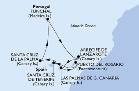 *Към цената е дължима и допълнителна такса обслужване на кораба в размер на 0 € / 0 лв.- Маршрут на круиза: Рим (порт Чивитавекия) - Генуа - Марсилия - Барселона - В открито море - Кадиз - Казабланка - Малага - Аликанте - В открито море - Рим (порт Чивитавекия)