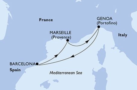 *Към цената е дължима и допълнителна такса обслужване на кораба в размер на 0 € / 0 лв.- Маршрут на круиза: Генуа - В открито море - Тарагона - Марсилия - Генуа