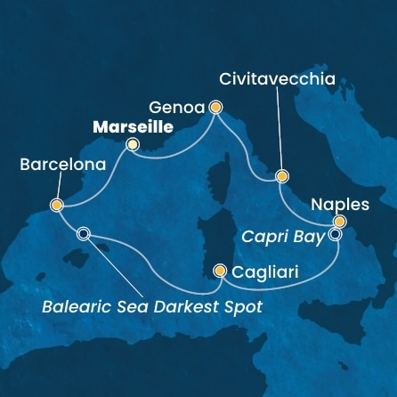 *Към цената е дължима и допълнителна такса обслужване на кораба в размер на 77 € / 150.60 лв.- Маршрут на круиза: Марсилия - Барселона - В открито море - Каляри (Сардиния) - Неапол - Рим (порт Чивитавекия) - Генуа - Марсилия