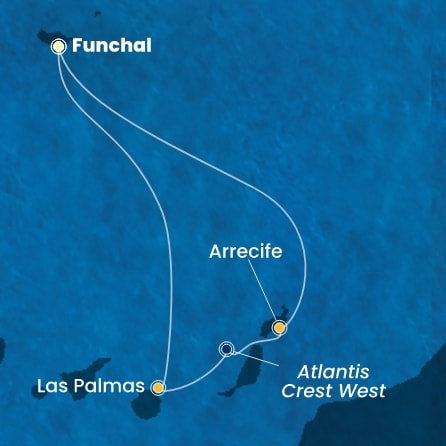 *Към цената е дължима и допълнителна такса обслужване на кораба в размер на 55 € / 107.57 лв.- Маршрут на круиза: Мадейра (Фуншал) - В открито море - Лансароте (Аресифе) - Лас Палмас (Гран Канария) - В открито море - Мадейра (Фуншал)