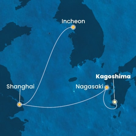 *Към цената е дължима и допълнителна такса обслужване на кораба в размер на 66 € / 129.08 лв.- Маршрут на круиза: Инчон (Сеул) - В открито море - Бусан - Сасебо - Яцуширо - Кагошима - Нагасаки