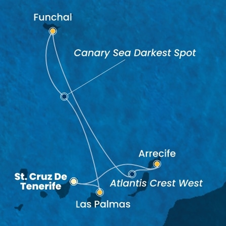 *Към цената е дължима и допълнителна такса обслужване на кораба в размер на 77 € / 150.60 лв.- Маршрут на круиза: Тенерифе (Санта Крус) - Тенерифе (Санта Крус) - Лансароте (Аресифе) - Atlantis Crest West - В открито море - Мадейра (Фуншал) - Canary Sea Darkest Spot - Canary Sea Darkest Spot - Лас Палмас (Гран Канария) - В открито море - Тенерифе (Санта Крус)