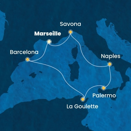 *Към цената е дължима и допълнителна такса обслужване на кораба в размер на 77 € / 150.60 лв.- Маршрут на круиза: Марсилия - Савона - Неапол - Палермо (Сицилия) - Ла Гулет (Тунис) - В открито море - Барселона - Марсилия