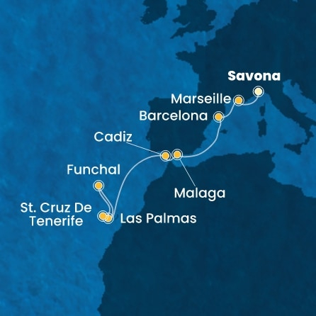 *Към цената е дължима и допълнителна такса обслужване на кораба в размер на 110 € / 215.14 лв.- Маршрут на круиза: Савона - Марсилия - Барселона - В открито море - Малага - Кадиз - В открито море - Лас Палмас (Гран Канария) - Мадейра (Фуншал) - В открито море - Тенерифе (Санта Крус)