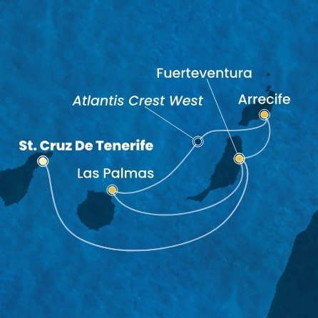 *Към цената е дължима и допълнителна такса обслужване на кораба в размер на 77 € / 150.60 лв.- Маршрут на круиза: Тенерифе (Санта Крус) - Фуертевентура (Пуерто дел Росарио) - Лансароте (Аресифе) - Лансароте (Аресифе) - Atlantis Crest West - Лас Палмас (Гран Канария) - Фуертевентура (Пуерто дел Росарио) - Тенерифе (Санта Крус) - Тенерифе (Санта Крус)