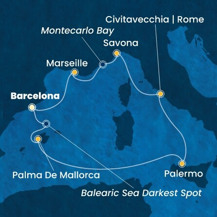 *Към цената е дължима и допълнителна такса обслужване на кораба в размер на 77 € / 150.60 лв.- Маршрут на круиза: Барселона - Около Балеарите - Около Балеарите - Палма де Майорка - В открито море - Палермо (Сицилия) - Рим (порт Чивитавекия) - Савона - Montecarlo Bay - Марсилия - Барселона