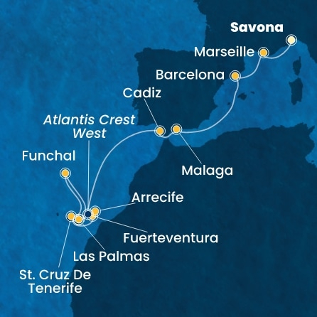 *Към цената е дължима и допълнителна такса обслужване на кораба в размер на 154 € / 301.20 лв.- Маршрут на круиза: Савона - Марсилия - Барселона - В открито море - Малага - Кадиз - В открито море - Лас Палмас (Гран Канария) - Мадейра (Фуншал) - В открито море - Тенерифе (Санта Крус) - Тенерифе (Санта Крус) - Фуертевентура (Пуерто дел Росарио) - Лансароте (Аресифе) - Atlantis Crest West - Лас Палмас (Гран Канария)