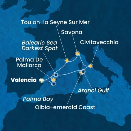 *Към цената е дължима и допълнителна такса обслужване на кораба в размер на 77 € / 150.60 лв.- Маршрут на круиза: Валенсия - В открито море - Олбия (Сардиния) - Рим (порт Чивитавекия) - Савона - Ла Сен сюр Мер (Тулон) - Палма де Майорка - Валенсия