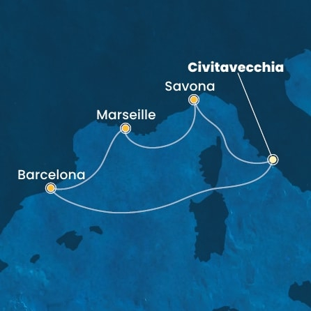 *Към цената е дължима и допълнителна такса обслужване на кораба в размер на 55 € / 107.57 лв.- Маршрут на круиза: Рим (порт Чивитавекия) - Савона - Марсилия - Барселона - В открито море - Рим (порт Чивитавекия)