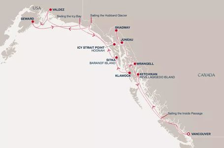 - Маршрут на круиза: Ванкувър - В открито море - Кечикан - Клауок - Ситка - Ледник Хабард - Валдес - Сюърд - Леденият залив - Айси стрейт поинт (Хуна) - Скагуей - Джуно - Врангел - В открито море - Ванкувър