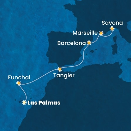 *Към цената е дължима и допълнителна такса обслужване на кораба в размер на 77 € / 150.60 лв.- Маршрут на круиза: Лас Палмас (Гран Канария) - Мадейра (Фуншал) - В открито море - Танжер - В открито море - Барселона - Марсилия - Савона