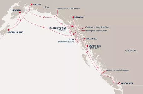 - Маршрут на круиза: Ванкувър - В открито море - Уорд Коув - Айси стрейт поинт (Хуна) - Ледник Хабард - Валдес - Кодиак - Сюърд - В открито море - Ситка - Скагуей - Ендикот Арм Доус (Ледник) - Трейси-Арм Фиорд - Врангел - В открито море - Ванкувър