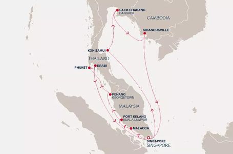 - Маршрут на круиза: Сингапур - Малака - Порт Кланг (Куала Лумпур) - Пенанг - Пукет (Тайланд) - Краби - В открито море - Сингапур - В открито море - Ко Самуи - Лаем Чабанг - Лаем Чабанг - Сихануквил - В открито море - Сингапур