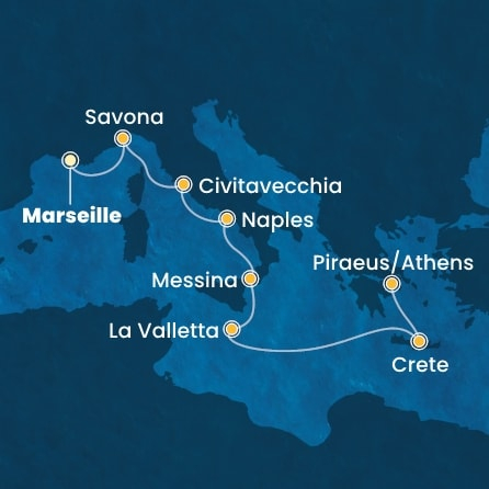 *Към цената е дължима и допълнителна такса обслужване на кораба в размер на 88 € / 172.11 лв.- Маршрут на круиза: Марсилия - Савона - Рим (порт Чивитавекия) - Неапол - Месина - Валета - В открито море - Ираклион (Крит) - Атина (Пирея)