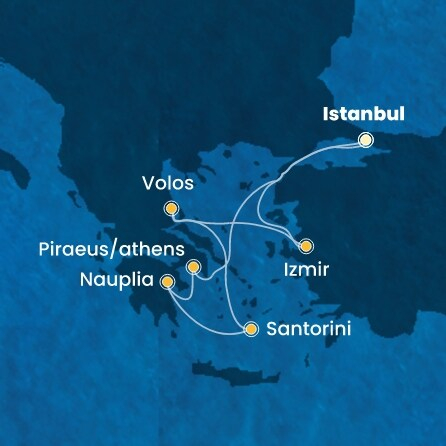 *Към цената е дължима и допълнителна такса обслужване на кораба в размер на 77 € / 150.60 лв.- Маршрут на круиза: Истанбул - Измир - Волос (Метеора) - Santorini (Greece) - Нафплио - Атина (Пирея) - В открито море - Истанбул