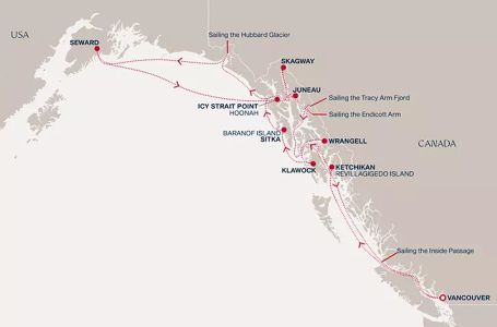 - Маршрут на круиза: Ванкувър - В открито море - Кечикан - Клауок - Ситка - Джуно - Ледник Хабард - Сюърд - В открито море - Айси стрейт поинт (Хуна) - Скагуей - Трейси-Арм Фиорд - Ендикот Арм Доус (Ледник) - Врангел - В открито море - Ванкувър