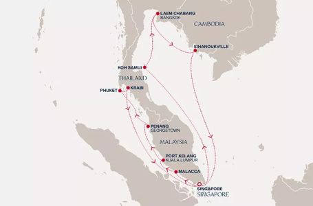 - Маршрут на круиза: Сингапур - Малака - Порт Кланг (Куала Лумпур) - Пенанг - Пукет (Тайланд) - Краби - В открито море - Сингапур - В открито море - Ко Самуи - Лаем Чабанг - Лаем Чабанг - Сихануквил - В открито море - Сингапур