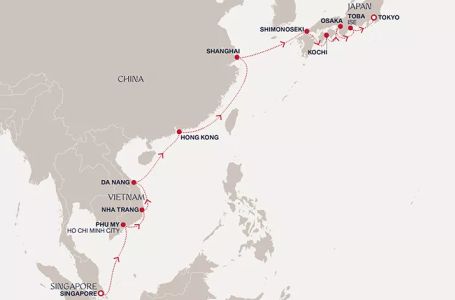 - Маршрут на круиза: Сингапур - В открито море - Фу ми - Фу ми - На Транг - Да Нанг (Виетнам) - В открито море - Хонконг - В открито море - Шанхай - Шанхай - В открито море - Симоносеки - Кочи (Япония) - Осака - Тоба - Токио