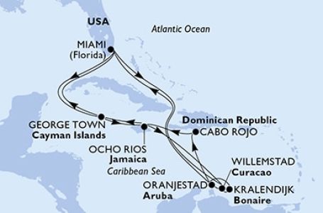 *Към цената е дължима и допълнителна такса обслужване на кораба в размер на 0 € / 0 лв.- Маршрут на круиза: Маями (Флорида) - В открито море - В открито море - Кюрасао (Вилемстад) - Аруба (Оранестад) - В открито море - Кабо Рохо - Ямайка (Очо Риос) - Кайманови о-ви (Джордж Таун) - В открито море - Маями (Флорида) - В открито море - Кайманови о-ви (Джордж Таун) - Ямайка (Очо Риос) - В открито море - Кюрасао (Вилемстад) - Бонер (Кралендайк) - Аруба (Оранестад) - В открито море - В открито море - Маями (Флорида)