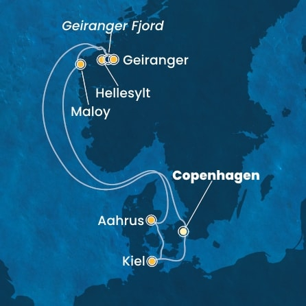 *Към цената е дължима и допълнителна такса обслужване на кораба в размер на 77 € / 150.60 лв.- Маршрут на круиза: Кил - Копенхаген - В открито море - Хелесюлт - Гейрангер - Молe - В открито море - Орхус - Кил