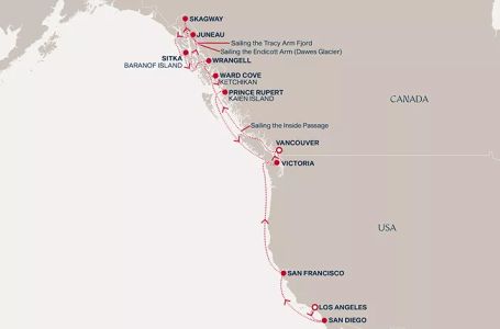- Маршрут на круиза: Лос Анджелис - Сан Диего - В открито море - Сан Франциско - Сан Франциско - В открито море - Виктория (Британска Колумбия) - Ванкувър - В открито море - Врангел - Джуно - Ендикот Арм Доус (Ледник) - Трейси-Арм Фиорд - Скагуей - Ситка - Уорд Коув - Принц Рупърт - В открито море - Виктория (Британска Колумбия) - Ванкувър