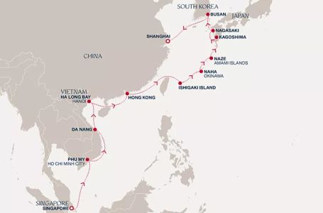 - Маршрут на круиза: Сингапур - В открито море - Фу ми - Фу ми - Да Нанг (Виетнам) - Халонг бей (Ханой) - В открито море - Хонконг - В открито море - Окинава (Исигаки, Япония) - Наха (Япония) - Назе - Кагошима - Нагасаки - Бусан - В открито море - Шанхай