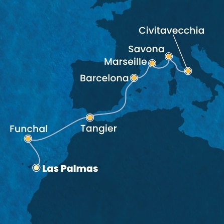 *Към цената е дължима и допълнителна такса обслужване на кораба в размер на 88 € / 172.11 лв.- Маршрут на круиза: Лас Палмас (Гран Канария) - Мадейра (Фуншал) - В открито море - Танжер - В открито море - Барселона - Марсилия - Савона - Рим (порт Чивитавекия)