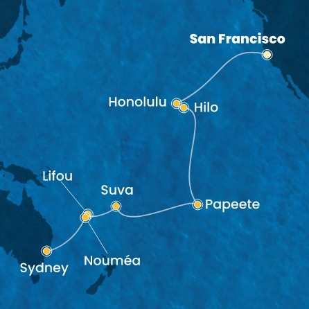 *Към цената е дължима и допълнителна такса обслужване на кораба в размер на 286 € / 559.37 лв.- Маршрут на круиза: Сан Франциско - Сан Франциско - В открито море - В открито море - В открито море - В открито море - В открито море - Хонолулу (о-в Оаху, Хавай) - Хило (Хавай) - В открито море - В открито море - В открито море - В открито море - В открито море - Таити (Папеете) - В открито море - В открито море - В открито море - В открито море - В открито море - Сува (Фиджи) - В открито море - Лифу - Нумеа - В открито море - В открито море - Сидни