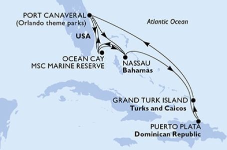*Към цената е дължима и допълнителна такса обслужване на кораба в размер на 0 € / 0 лв.- Маршрут на круиза: Орландо (Порт Канаверал) - Насау - Оушън Кий - MSC частен резерват - В открито море - Орландо (Порт Канаверал) - Оушън Кий - MSC частен резерват - Насау - В открито море - Амбър Коув - Гранд Търк - В открито море - Орландо (Порт Канаверал)