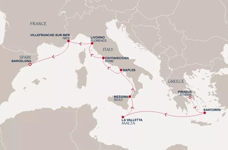 - Маршрут на круиза: Атина (Пирея) - Санторини - В открито море - Валета - Месина - Неапол - Рим (порт Чивитавекия) - Ливорно (Флоренция и Пиза) - Вилфранш (Ница) - В открито море - Барселона