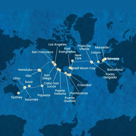 - Маршрут на круиза: Савона - Марсилия - Барселона - В открито море - Лисабон - В открито море - В открито море - Понта Делгада, Азорски острови - Прая да Витория - В открито море - В открито море - В открито море - В открито море - В открито море - Ню Йорк - Ню Йорк - В открито море - В открито море - Порт Евърглейдс (Флорида) - Порт Евърглейдс (Флорида) - Халф Мун Кей ризорт - В открито море - В открито море - В открито море - Кристобал (Панама) - В открито море - В открито море - Пунтаренас - В открито море - Пуерто Кецал - В открито море - В открито море - Пуерто Ваярта (Мексико) - Кабо сан Лукас (Мексико) - В открито море - Сан Диего - Лос Анджелис - Лос Анджелис - В открито море - Сан Франциско - Сан Франциско - В открито море - В открито море - В открито море - В открито море - В открито море - Хонолулу (о-в Оаху, Хавай) - Хило (Хавай) - В открито море - В открито море - В открито море - В открито море - В открито море - Таити (Папеете) - В открито море - В открито море - В открито море - В открито море - В открито море - Сува (Фиджи) - В открито море - Лифу - Нумеа - В открито море - В открито море - Сидни