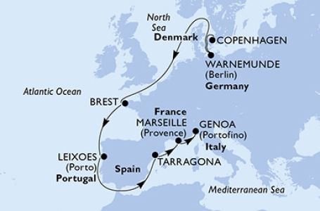 *Към цената е дължима и допълнителна такса обслужване на кораба в размер на 0 € / 0 лв.- Маршрут на круиза: Копенхаген - Варнемюнде - В открито море - В открито море - Брест - В открито море - Леишоиш порт (Португалия) - В открито море - В открито море - Тарагона - Марсилия - Генуа