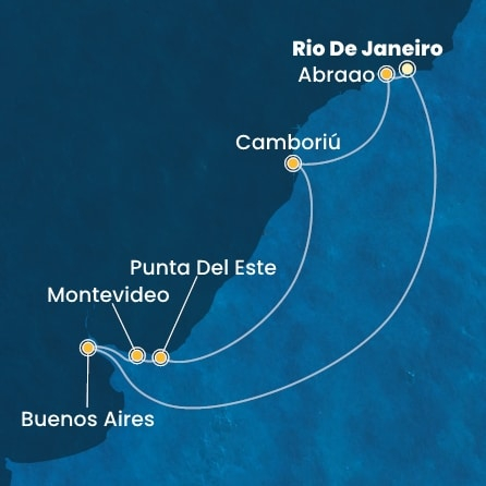 *Към цената е дължима и допълнителна такса обслужване на кораба в размер на 99 € / 193.63 лв.- Маршрут на круиза: Рио де Жанейро - В открито море - В открито море - Буенос Айрес - Монтевидео - Пунта дел Есте - В открито море - Камбориу - Иля Гранде - Рио де Жанейро