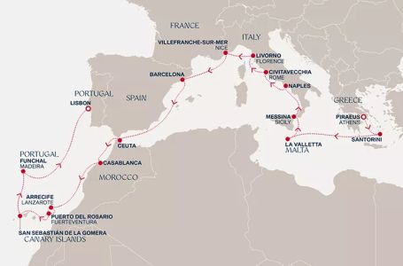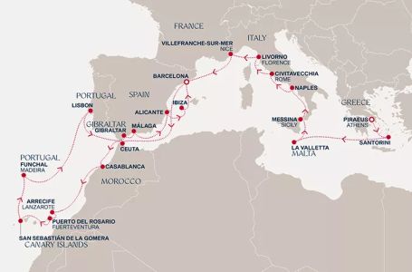 - Маршрут на круиза: Атина (Пирея) - Санторини - В открито море - Валета - Месина - Неапол - Рим (порт Чивитавекия) - Ливорно (Флоренция и Пиза) - Вилфранш (Ница) - В открито море - Барселона - В открито море - Сеута - Казабланка - Казабланка - В открито море - Лансароте (Аресифе) - Фуертевентура (Пуерто дел Росарио) - Ла Гомера (Сан Себастиан) - Мадейра (Фуншал) - Мадейра (Фуншал) - В открито море - Лисабон