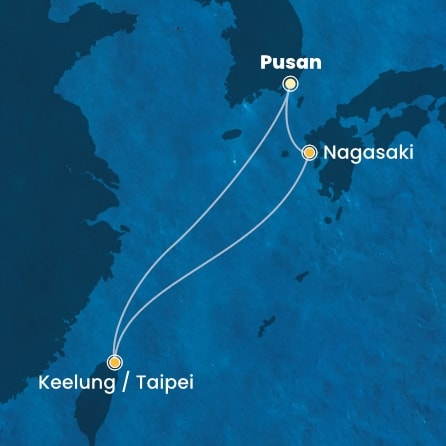 *Към цената е дължима и допълнителна такса обслужване на кораба в размер на 55 € / 107.57 лв.- Маршрут на круиза: Бусан - В открито море - Кеелунг (Тайван) - В открито море - Нагасаки - Бусан