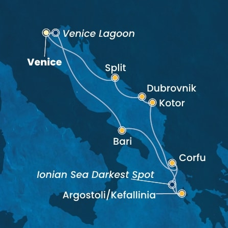 *Към цената е дължима и допълнителна такса обслужване на кораба в размер на 77 € / 150.60 лв.- Маршрут на круиза: Венеция (пристанище Маргера) - Бари - Корфу - Аргостоли (Кефалония) - Дубровник - Котор - Задар - Венеция (пристанище Маргера)