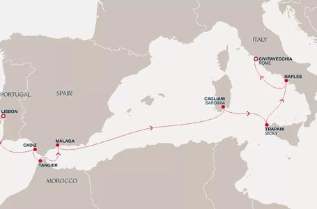 - Маршрут на круиза: Лисабон - Лисабон - Кадиз - Танжер - Малага - Малага - В открито море - Каляри (Сардиния) - Трапани (Сицилия) - Неапол - Рим (порт Чивитавекия)
